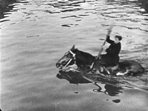 Buster makes his way to a country club. He sees a young woman struggling to get onto a horse (Virginia Fox). He kneels to help her and she invites him on their hunt. Antics with his horse ensue (including a treacherous journey across a river and a mistake that lands him on the back of a bull instead). At one point, trying to rope his horse, Buster instead ropes a bear. He jumps through a window to escape.